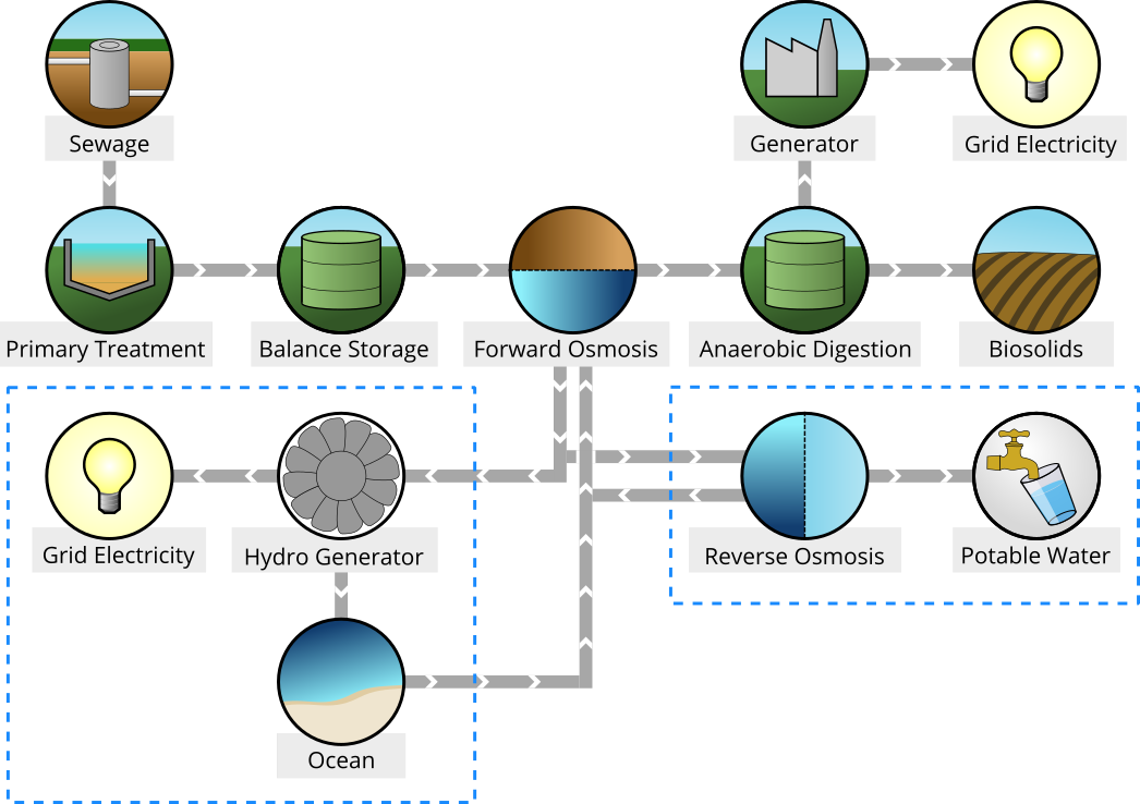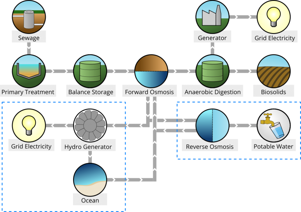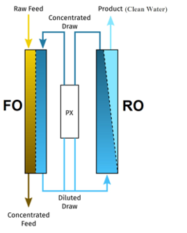 • The clean water extracted from the wastewater can be recovered from the draw solution using reverse osmosis thus reconstituting the draw solution.